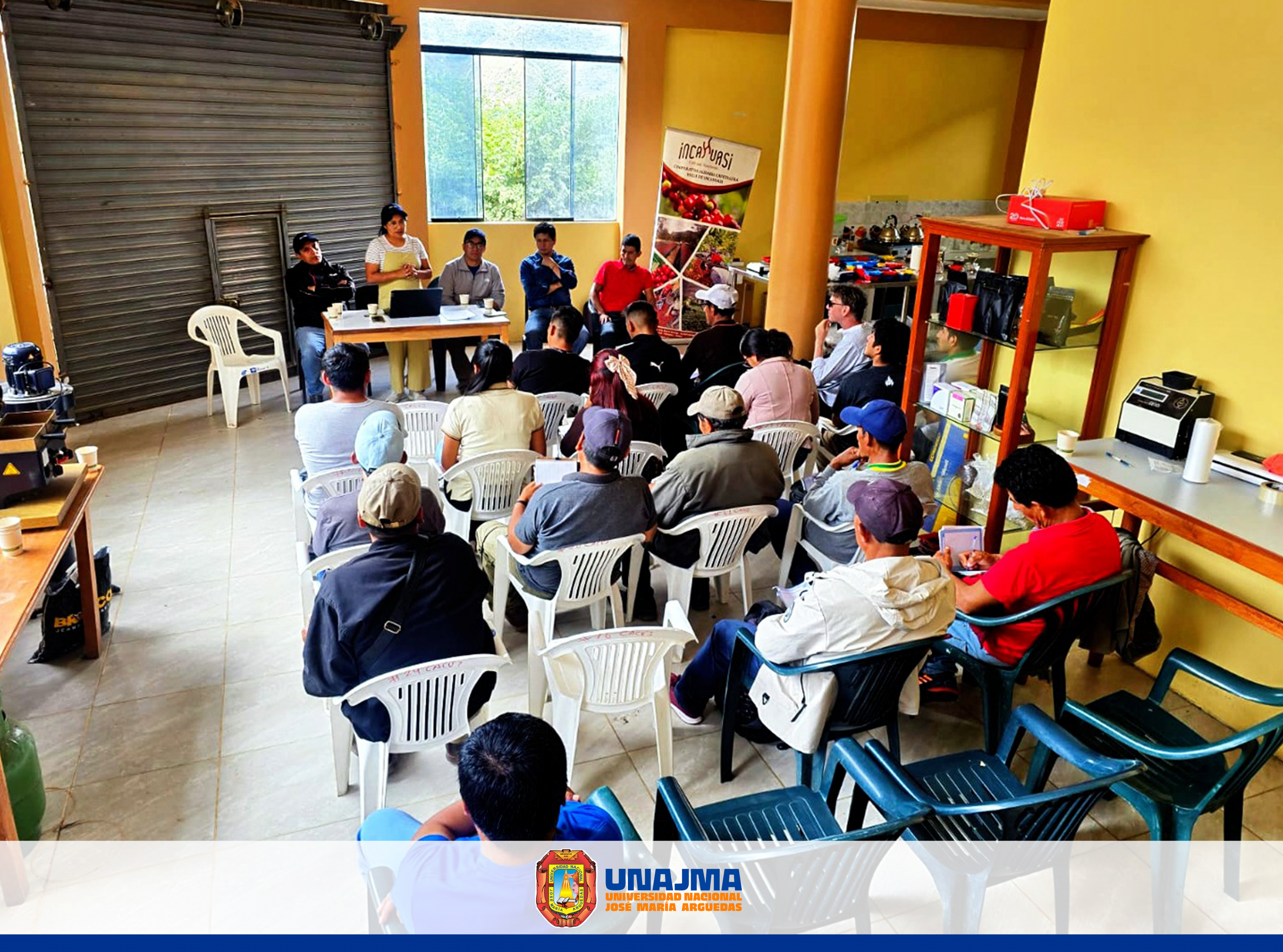 Docentes investigadores de la Universidad Nacional José María Arguedas, representantes de la Cooperativa Agraria Cafetalera Valle de Incahuasi, profesionales de la cooperativa, el agente comercial internacional Justin Miles (Australia) y los presidentes de los comités que representan a 394 socios de la cooperativa, sostuvieron una reunión de trabajo en la localidad de Amaybamba, distrito de Inkawasi el martes 16 de diciembre del 2025.
